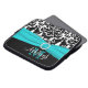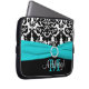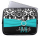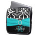水の青くフェイクなリボンおよび宝石のブローチが付いているこの名前入りな白黒ダマスク織のラップトップスリーブはあなた自身の名前、モノグラム、商号、または他の文字とカスタマイズべきあなたのためのテキスト・ボックスを備えています。 カスタマイズ助けを必要としたらniteowlstudio@gmail.comに電子メールを送って下さい。