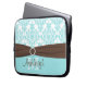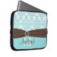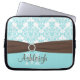 フェイクなリボンおよび宝石のブローチが付いているこの名前入りな水の青、チョコレートbrwonおよび白いダマスク織のラップトップスリーブはあなた自身の名前、モノグラム、商号、または他の文字とカスタマイズべきあなたのためのテキスト・ボックスを備えています。 カスタマイズ助けを必要としたらniteowlstudio@gmail.comに電子メールを送って下さい。