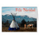 太平洋北西部のティピの近くに先住民のアメリカ人とその馬のイメージ。背景の山々の高斜面に雪が定着している。スペインの文字読の「Feliz Navidad」が赤で表示される。