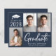 大きな白いモダンタイポグラフィの写真コラージュ「大学院」と卒業生のクラスの年、名前、学校やタイポグラフィの白い大学を含むバジェット・ダークフレンドリーブルーの卒業記念パーティーの招待シンプル。背面にパーティー詳細を追加。