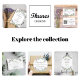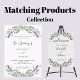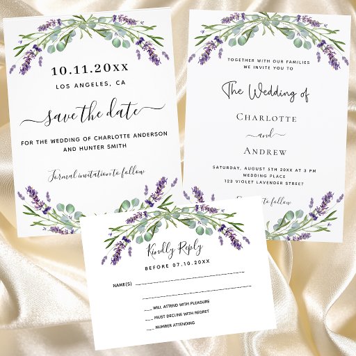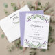 ラベンダーの花飾とユーカリの緑の白い背景。名前と詳細のパーソナライズカバー写真を追加する。文字が出来るフォトオーバーレイ読がある。戻る:詳細結婚やRSVPのQRコードにWebサイトのURLを追加。