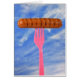 夏の空を背景にピンクのプラスチックフォークでホットドッグを焼く