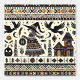 不気味さ、クロケード、可愛さ、フォークアートの大事な行事のための壁紙イラストレーションは、彼女の通常の仲間と彼女の家からショッピングのために行く魔女を備え幽霊のよく出るる – ジャックやランタン、黒い鳥や魔法のポーションを含む彼女の財布。秋フェスティバルやハロウィーンに最適。記念日や家の温暖化のための素晴らしい贈り物のために正しい。