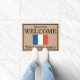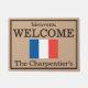 このカスタムのドアマットや屋外の敷物は、ベージュ色の背景の上に、中央のフランスの旗のイメージを映し出しています。敷物の上の言葉には「ビエンベヌ」と書いてあフランスのり、旗のすぐ上に印刷されていフランスのます。旗は青、白、はっきりした赤の美しい旗です。下部の近くにサンプルファミリ名が印刷されます。このドアマットをカスタマイズし、自分の姓名、会社名、またはメッセージや引用文をカスタム追加できます。敷物は黒い版で縁取りし縁どてある