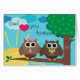 この挨拶状は木でとまるかわいいフクロウのカップルを特色にします!