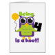 フクロウ4th誕生日Tシャツ、ボディスーツ、トートバッグ、カード、シールなど、カラフルグリーンと紫のフクロウと文字を搭載し読た「4はフロー!」。