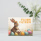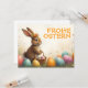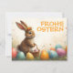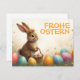 Ein niedlicher Osterhase mit einer Blumenkrone sitzt liebevoll inmitten bunter Osterier.In seinen Pfotenハルトer ein kleines Weidenkolbchen mit bemalten Eiern.ディセネイストフォンzarten Fruhlingsblumen und warmem Licht umgeben.フリンチェムオレンジのユバーデムハセンleuchtet die Aufschrift "Frohe Ostern" - ein herzlicher Grus, der die Leictigkeit and Freude des Fruhlingsfestes einfangt.
