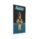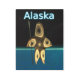 アイボリーの頭を持つ針先を持つ毛皮の服を着て、高度に様式化されたイヌイットの狩人を示唆する茶色のトーンのフラクタル伝統的画像。この画像は、暗黒の極地の冬を描いた背景に重ね合わされる。文字読の「アラスカ」は青と白白熱[赤熱]光を放つで現れる。