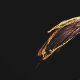 暗い背景数々のに、鳥や羽の生えた竜に似た、渦巻き状のフラクタル画像(赤、黄色、オレンジ)。