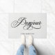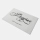 このフランスので素朴で、エレガントな玄関マットは灰色、リネン一見の背景の渦巻形ので、黒い書道の"bonjour"を言い、あなたの姓のための点を備えています。