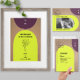 カードストックの背景にネオンの黄色と梅のインスパイアアーチが付く。プラムアーチの上にモノグラム。黒い文字の上に黄色のアーチと黒い線のアートフラワー離れ。
