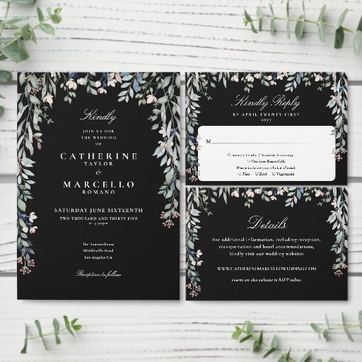 黒い背景エレガントにシックな白いタイポグラフィに設定された結婚お祝い詳細とワイルドフラワーの水の色のフローラアースタイリッシュチ結婚式招待状。あなたの結婚ウェブサイトの詳細とQRコードの逆に。Thisisnomeによる設計©