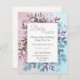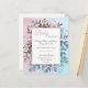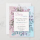 予算の赤ん坊シャワーまたはジェンダーが招待を明らかにする。青とピンクの水色の背景には、デザインは青とピンクの花で囲まれたクリーム文字エレガントボックスで構成されている。タイポグラフィ文字読ベビーお名前。完全なイベントと詳細を前面連絡と背面に追加してパーソナライズ。