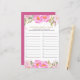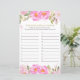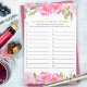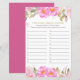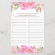 ブライダルシャワーゲームのパーソナライズされた応答カード、新婦または新婦の名前。ピンクのフローラデザインと水彩の花の開花と葉、金ゴールドの芽と書エレガント類。お客様の質問や推測ゲームや結婚ブライダルシャワーで使用するのに最適な番号の付いたラインで最大20の回答を追加する。