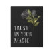 ゴシックとダークメタルのアートプリントは、ブラックバラのイラストレーションと「魔法に信頼」と言う文字を搭載した。