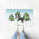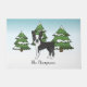 可愛い白黒のボストンテリアのオリジナル漫画イラストレーション。3本の緑のモミの木と降り積もる雪が積もった冬のシーンに犬を置く。背景は青から白のグラデーション与えのデザインは、寒い冬の日に見える。名前にはパーソナル化可能な文字領域もある。