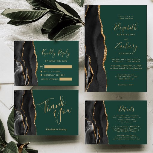 このメエレガントニューモダンは結婚、金ゴールドグリッターでトリミングされた水色の黒い瑪瑙の背景を備えフェイクている。文字はエメラルドエレガントグリーンの長方形の金ゴールド色の手書き文字とカッパープレートフォントで表示される。黒いゲートデザインは逆に繰り返される。