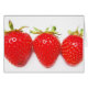Drei rote, sussse Erdberen auf weissem Hintergrund sind auf dieser Grusskarte zu sehen.