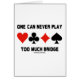 あなもし感じた遊は、朝の早朝にブリッジやブリッジのトーナメントの早朝に決して多くのブリッジを作り出すことはできないと思い出せますこのグリーティングカードは、ことわざ「One Can Never Too Much Bridge」と一緒に4枚のカードで構成されています。次にこのグリーティングカードを送る時に、他の人が舌の頬のブリッジ/重複ブリッジのスタイルの用量でダブルテイクを行う!