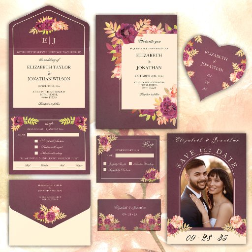そしてエレガント、ロマンチックな写真と日付カードを保存お気に入りの,豊かで暖かい暖かい色の紅葉と水の色のバラをバーガンディな背景に自然特集。カード背面の水色フローラデザインは、ベージュの背景にモノグラムを付けた黄色、緑、焦げ離れオレンジ色、テラコッタ色を含む。詳細のパーソナライズ:新郎新婦の名前、日付とイニシャル。より多くのマッ結婚チのアイテムは私のロマンチックなブルゴーニュ秋の秋の結婚式コレクションを参照して。