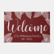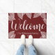 ミニマルな白い葉のデザインに囲まれた鮮明な白いスクリプトのレタリングことわざ「ようこそ」と豊かなブルゴーニュ赤いdoormat。この秋の底エレガントは、あなたの家族の名前と白い角括弧で囲まれた文字で確立された日付を特徴とする。