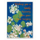 Aかわいらし、ジュディ・アダムソンのスクリーンプリントから、青い背景に白いゲラニウムを持つ膝手術を持つ人のためのフローラ「Get Well」グリーティングカード。独自の内部メッセージを追加できる
