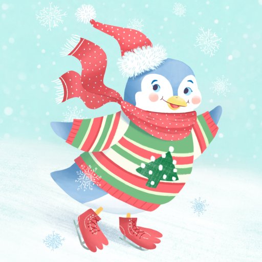 冬のフェスティバルペンギンが氷の上を楽しげに滑り降り、小さな青い空に繊細な雪の結晶秋!オリジナルイラストレーションバイノエルスノー。