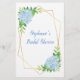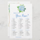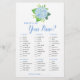このブライダルシャワーのゲームカードは財布の中に何があるか。デザインは水色の青いあじさい花と背フェイク部の金ゴールド幾何学的デザインを特徴とする。花嫁の名前でカードの背面をパーソナライズ。一致する製品が利用可能。
