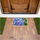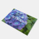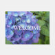 青あじさい花の花びらと緑の葉の写真のイメージを特徴とする装飾ウェルカムドormat。素敵なフローラデザイン!屋内を使用するか、カバーされた入口領域で使用する。フォーマットのサイズを選択する。