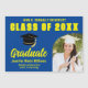 青と黄モダン色のカスタム卒業発表マグネットカードとアーチ下の卒業写真モダン。2025年のクラスのクラシック名の大学タイポグラフィと大学の文字を備えている。カスタマイズ卒業年はシックな手書き文字と黒いグラッドキャップの下にポストカード素晴らし用。背面にパーティー詳細を追加。