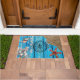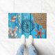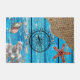 青い木の素朴な背景のテクスチャーフェイク、ヒラメ、オレンジのヒトデ、シーシェル、白いサンゴとコンパスを中心にカスタム文字。ひねり航海ののあるモダンデザイン。文字カスタマイズを自分のものにする。