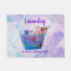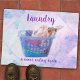 このデザインは、ハンガーにカラフルを折り畳んだ服が詰まった青いバスケットの写真と、洗剤ボトルとテンプレート文字を備えている。文字をカスタマイズし、文字を削除すクリックるかカスタマイズ、フォントのスタイル、サイズ、および色を選択する。