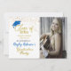 青と金ゴールドの学校の色で卒業パーティーの招待。青いキャップ、青と白の風船と金ゴールドのグリッターフェイクで作成され、自分の写真のための宇宙。すべての文字の前面と背面はすでにフォーマットされ、独自の文字詳細に対応。この同じデザインで使用できる他の色。写真クレジット:Pixabay image by Lorri Lang