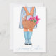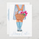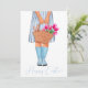 ピンクのチューリップとバニーの耳で満たされたバスケットと柔らかいブルーのファッションの女の子のイラストレーションとイースターグリーティングカード。下部に「ハッピーイースター」という言葉を付け加える自分のメッセージを背面に追加する。