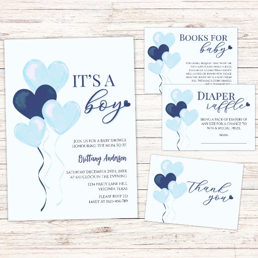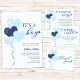 このデザインはヴァレンティーンをテーマにした赤ちゃんシャワーのシールで、「It's a Boy」のタイトルと青いハートバルーンの水色イラストレーションが付いている。この製品は簡単にパーソナライズされたあなたの詳細と一緒に。