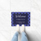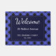 青いスタイリッシュ水牛の格子状のデザインと目を引くドormat。バッファローチェックパターン型枠は、白い文字とダークブルーの中央部に魅力的なサラウンドを。文言はスクリプトタイポグラフィの先頭の「ようこそ」から始まる。この下には、この家パーソナライズされた宅であなたの住所、名前、日付とマットが置かれる。理想的な引っ越し祝いパーティーギフトと魅力的な温かい歓迎のためのお客様。