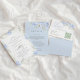 フローラウェーエレガントディングRSVPカード、パステルブルー繊細なアジサイフローラ配置とタイポグラフィを搭載しエレガントた。