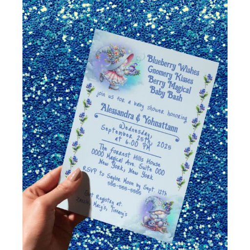 「Blueberry Wishes and Gnomeryキス」は、新しい人生の本質を美しく捉え祝た招待状である。このデザインは、雲、青と紫の色合いを備え、男の赤ちゃんシャワーに適しており、かわいいスカートの女の子格言もベビーガールシャワーに適している。ブルーベリーと格言のこの魅惑的なテーマは、新生児を歓迎する魔法を体現している。ジューシーなブルーベリーと格言の楽しいイメージお洒落は、全ての客インスパイアに喜びとお誘いを生み出す。忘れられない赤ちゃんのシャワーを作りなさい!この特別な機会のためのより多くのおもしろい祝アイディアのための私たちのコレクションをチェック。
