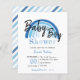 かわいい予算男の赤ちゃんベビーシャワー招待状。青いトーンの抽象芸術レインボーストライプ男の赤ちゃんの背景には、黒いタイポグラフィの文字読のシャワー。完全なイベントと詳細を追加し連絡てパーソナライズ。