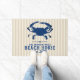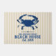 "ビーチハウス"、あなたの家族の名前と沿岸のトープの文字を特徴とするビーチシックな青いカニストライプのdoormat。 date.