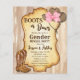 ブーツまたは弓ジェンダーはカウボーイのパーティー予算の招待を明らかにする。水の色の木の背景、カウボーイブーツと帽子とヴィンテージラベルの感じデザイン。
