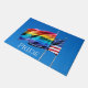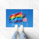 真っ青な空を背景に浮かび上がる虹のプライドの旗とアメリカの国旗を使った明るい模様。歓迎祝的で多様なアメリカと故郷だファイアアイランドのさくらんぼグローブで撮影。プライド・コレクションの一部