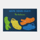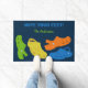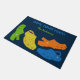 このおもしろいとカラフル形式は、あなたカスタマイズ自身のヘッドラインまたはスローガンとあなた自身の名前を持つ準備ができている。ウェルカムマットは、ライムグリーン、イエロー、オレンジと明るいブルーのネイビーブルーの背景にプラスチックのモカシンまたはクログスタイルシューズのカラフルコラージュを備えている。
