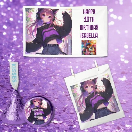 女パーソナライズされたのバースデーパーティ招待状。猫耳と紫と黒のセーターを着た可愛いアニメガール。ゲーマーの女の子や音楽愛好家、または毛皮のテーマを愛する人のための可愛い誕生日パーティーテーマ。