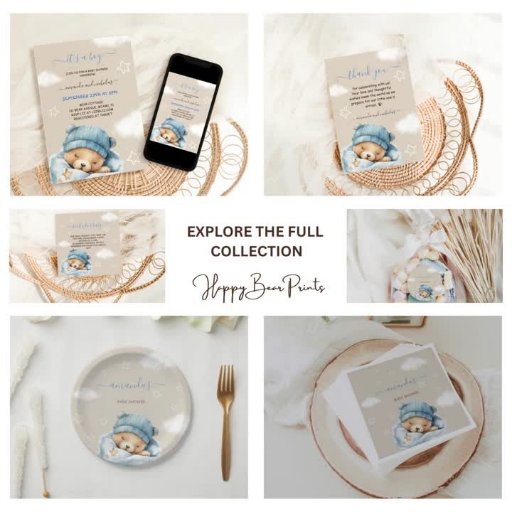 かわいミニマルい、モダン、水の色それは男の子の熊の雲の男の赤ちゃんシャワー招待状。