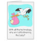 ベビーの漫画を運んでいるおもしろいなこうのとり。 新しいミイラおよびパパのためのお祝いカードとして適した。