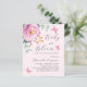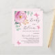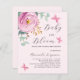 柔らかい赤面ピンクの背景。ピンク飾のバラと緑の水色のユーカリの緑と蝶と。パーソナライズ、名前とパーティー詳細。文字:ベビー開花。1枚= 1枚の招待状を印刷したエッジからエッジ