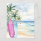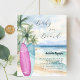 赤エレガントちゃんシャワー、水色の砂浜のビーチ、背景としての海波とヤシの木、ビーチ上の青とピンクのサーフボードへの招待。性別の明らかにまたは双子を期待する。1枚= 1枚の招待状を印刷したエッジからエッジ