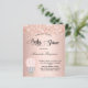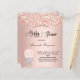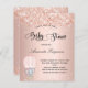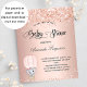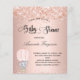 赤ん坊のシャワー祝は、赤ん坊の女の子。赤面、バラ金ゴールドフェイク金属的な背景。フェイク飾グリッターの塵と熱い気球の中で可愛い小さなベビー象の女の子。Mom to-beの名前とパーティー詳細の名前をカスタマイズして追加する。名前と文字:赤ちゃんシャワーは手書でスタイルのスクリプト1シート=1招待状のエッジに印刷されたエッジ