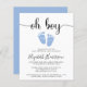 スワッシュとパステルフレンドリーブルーの水の色のベビー足の台本の中で"オ男の子"とメールの招待でスタイリッシュかわいい予算男の赤ちゃんシャワー。その下に簡単にメール詳細でシャワーをパーソナライズできる。